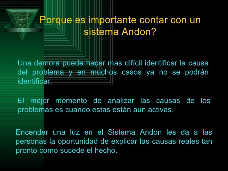 Andon es un vocablo que significa: linterna. El sistema Andon tiene sus gestores iniciales en Taylor y Henry Ford en Estados Unidos; tiene gran éxito en Japón en los 70's con el método Toyota y las estrategias Justo a Tiempo, y llega a su máximo desarrollo en su aplicación a la cadena de suministro (Lean Supply Chain). Características.