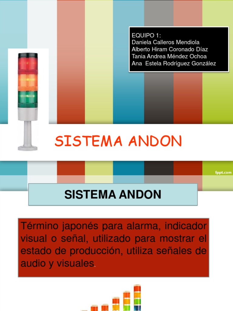 Sistema de control visual de producción. Los sistemas ANDON nacieron en Japón durante los años 70. En su idioma, la palabra significa "señal" o "linterna", algo que describe de manera bastante ajustada la manera de funcionar de esta herramienta industrial. Andon se usa habitualmente para aplicar el principio de Jidoka en la.