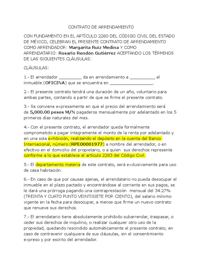 Formato de Contrato Arrendamiento Casa Habitacion Alquiler Propiedad