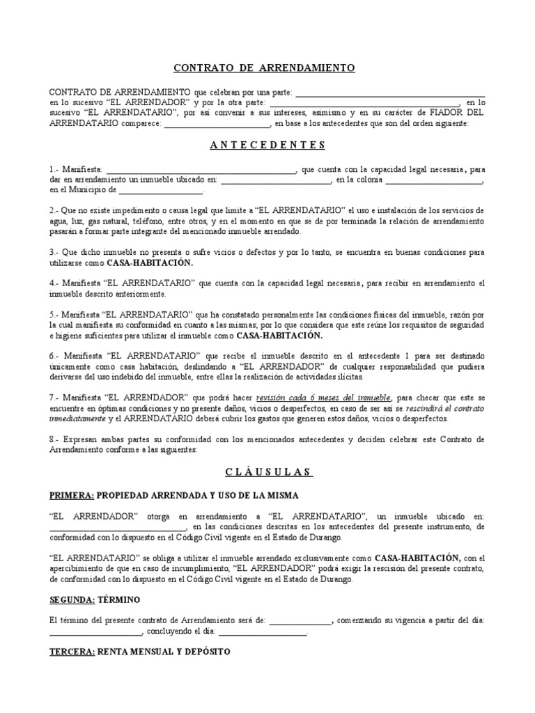 Contrato de Arrendamiento para casa habitación Alquiler Propiedad