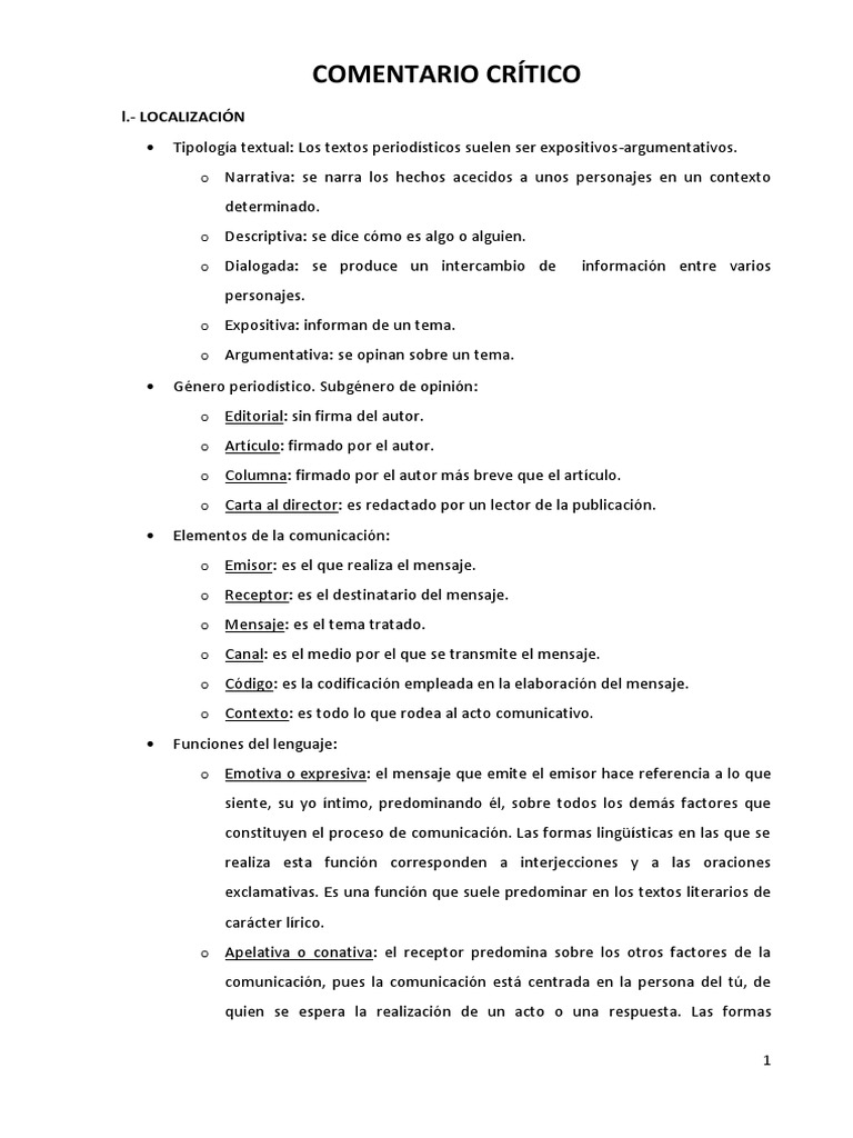 Un comentario crítico tiene una visión objetiva, la que presenta la idea o tesis que se va a comentar y los argumentos razonados; y otra subjetiva, cuando se expone la opinión personal del comentador. Es por ello que en un comentario crítico pueden alternarse la primera y la tercera persona, la opinión y la argumentación.