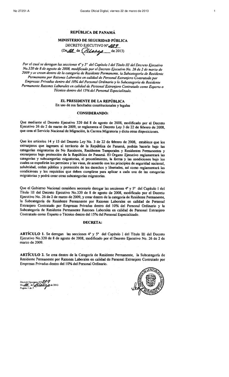 Decreto Ejecutivo N° 229 (de 22 de marzo de 2013)