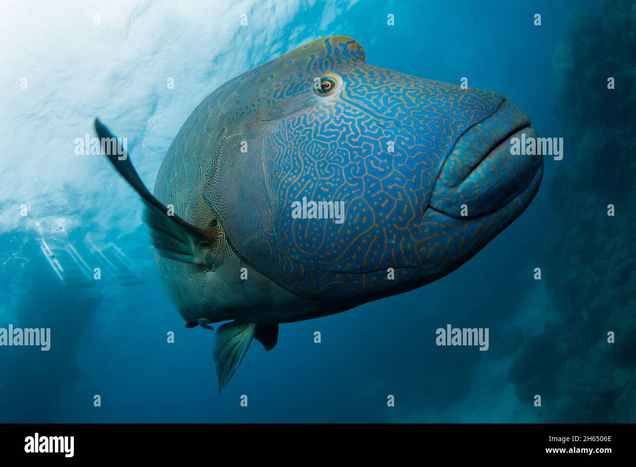 Un pez gordo maorí grande con cabeza de sumidero azul con patrón de oro o raja amarillenta
