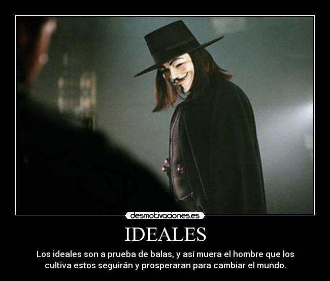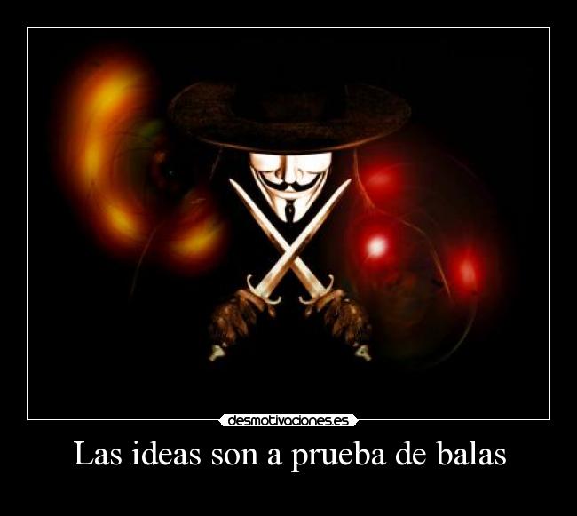 Los pensamientos son solo carne y sangre. Las ideas son a prueba de balas. Máscara de V de Venganza. La máscara que aparece en la historia fue creación de David Lloyd, uno de los autores del cómic basado en la película. Ella representa a una figura histórica que realmente existió, un soldado inglés llamado Guy Fawkes.