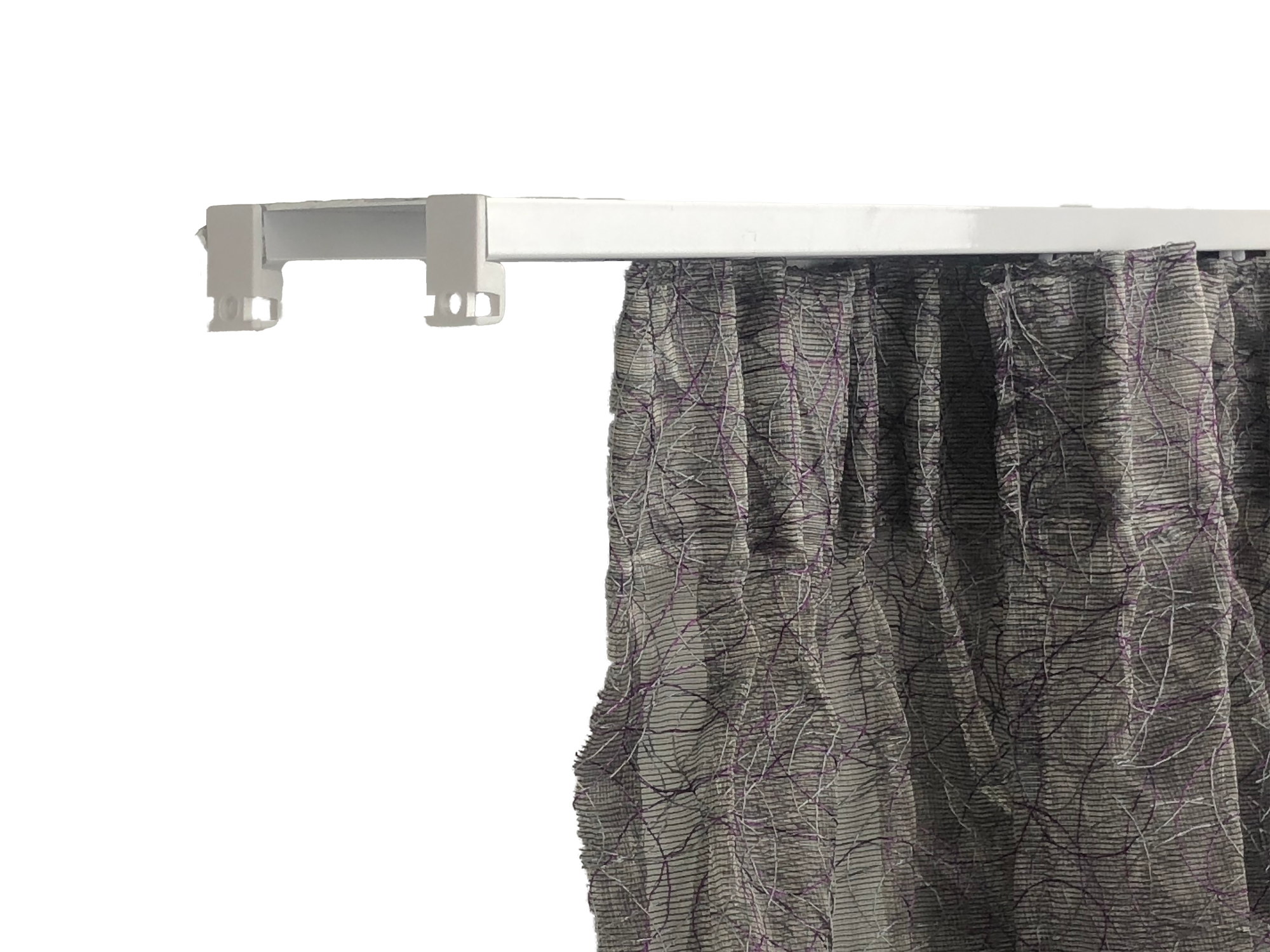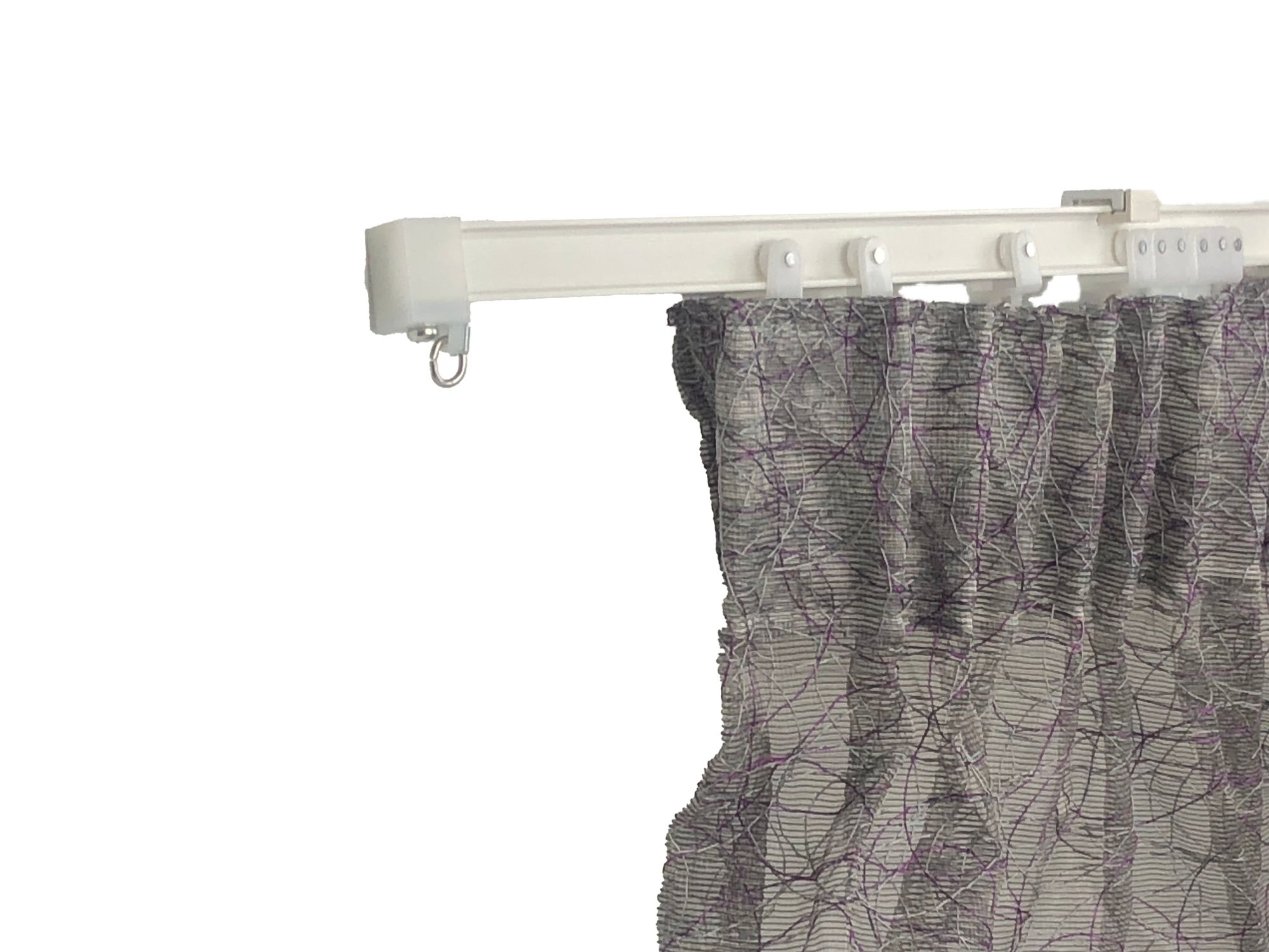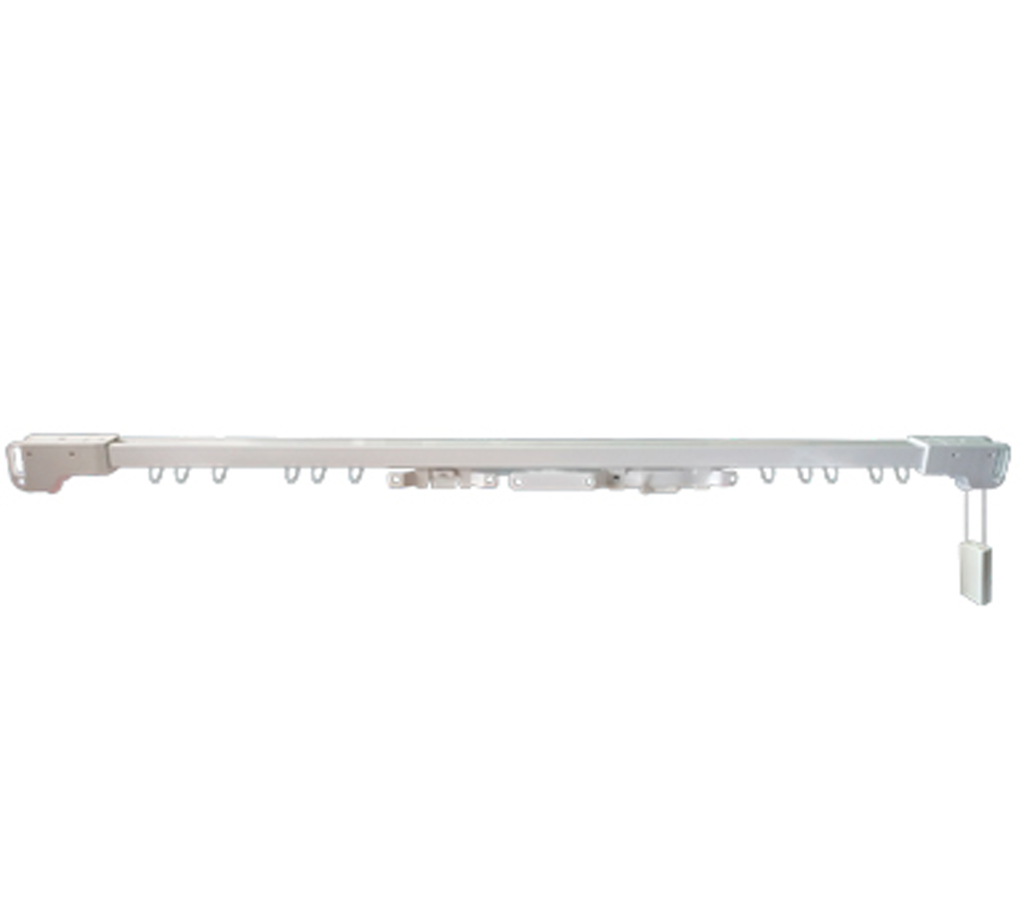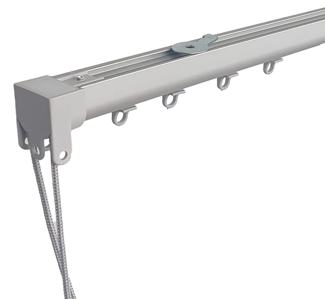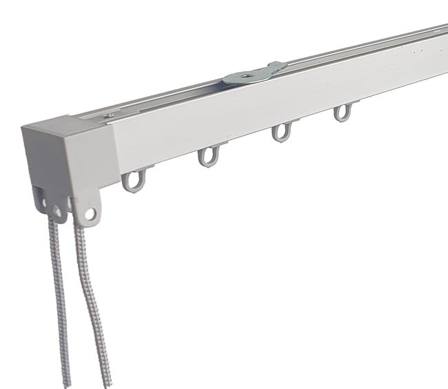 Riel a cordón pensado para la colocación de cortinas ligeras en espacios de 210 a 390 cm fabricado en acero lacado en color blanco. Presenta una estructura de fácil configuración con apertura central con la posibilidad de configurar la posición del accionamiento (derecha o izquierda) entre dos hojas de cortina. Se puede instalar en la pared, en el techo o entre dos paredes y es recortable.