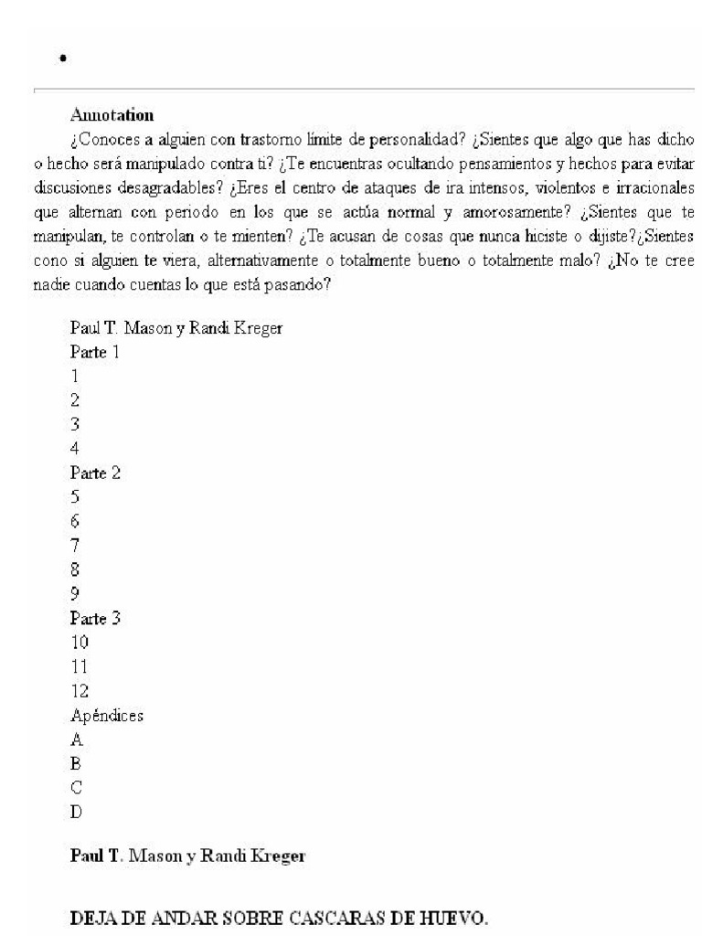 Books. Deja de andar sobre cáscaras de huevo. Paul T. Mason, Randi Kreger. Ediciones Pléyades, S.A., 2003 - Psychology - 262 pages. Conoces a alguien con trastorno límite de personalidad?Sientes que algo que has dicho o hecho será manipulado contra ti?Te encuentras ocultando pensamientos y hechos para evitar discusiones desagradables?Eres.