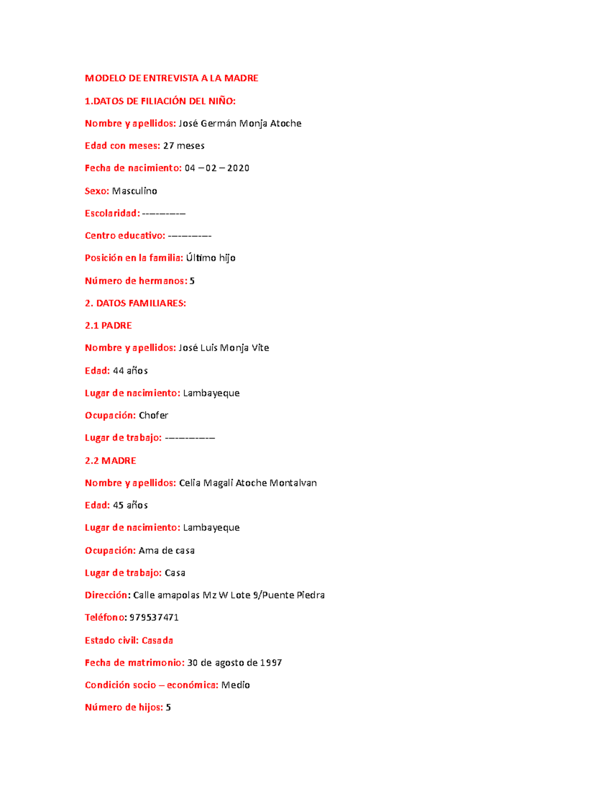 Modelo DE Entrevista A LA Madre MODELO DE ENTREVISTA A LA MADRE 1 DE FILIACIÓN DEL NIÑO