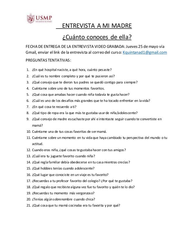Las mejores preguntas para conocer a tu madre. De seguro muchas veces habrás querido preguntarle cosas de su vida a tu madre pero no has sabido por dónde empezar. Te proponemos la siguiente dinámica en la que recopilamos 70 de las mejores interrogantes que puedes hacerle.. Bueno, para evitar que la dinámica se convierta en una entrevista.