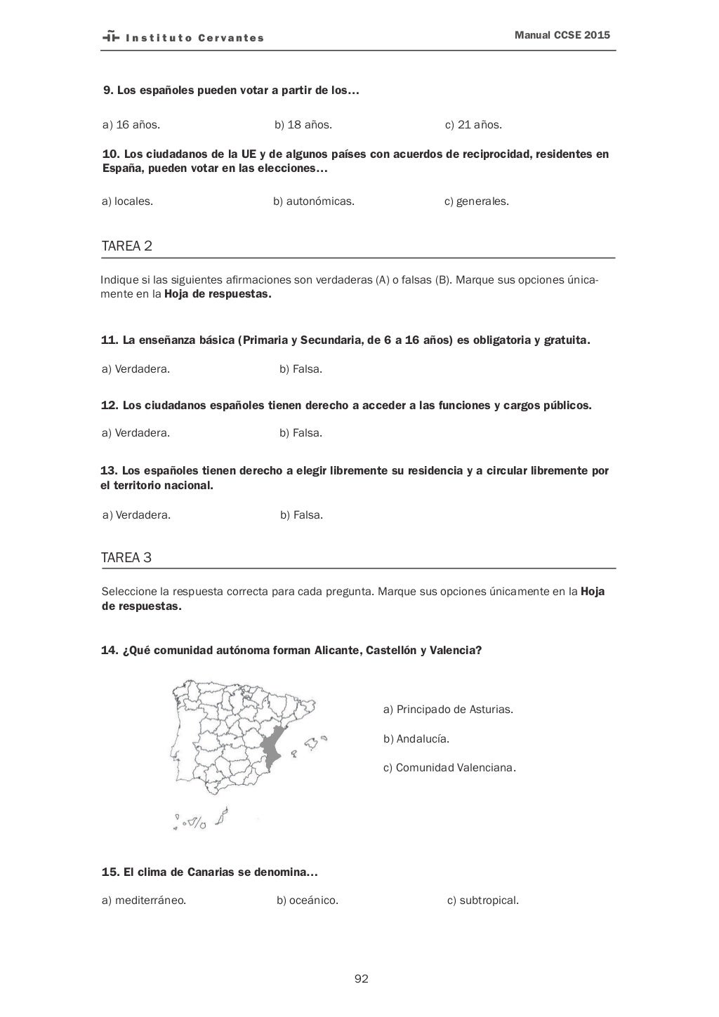 Test y Exámenes de Nacionalidad Española 2024 Gratis ⭐. En esta página podrás practicar para el examen de obtención de nacionalidad española. Esta prueba, llamada CCSE, es uno de los requisitos para conseguirla. Esta prueba, que organiza y gestiona el Instituto Cervantes, es una prueba que dura 45 minutos en la que hay 25 preguntas de.