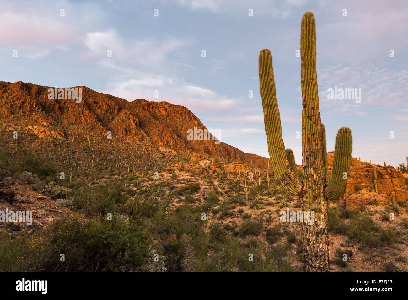Varios tipos de cactus y vegetación desértica frente a las montañas del desierto, el Parque de